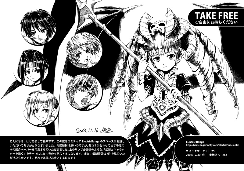 ■コミックマーケット75 2008/12/30(火) 東地区 リ-26a 超遅くなりましたが前日に何を言ってるんだという話ですが、コミティア86(2008/11/16)に参加します(笑)今回は新刊はございませんので、代わりと言っては何ですがペーパーを用意していこうと思います。そのペーパーには冬コミの予告をさせていただいてます。散々このサイトでも一部抜粋で載せている白黒シリーズをまとめたイラスト集で、本物はちゃんと全身描いてあります(笑)その配布するペーパーの画像をここにも載せておきます~。
